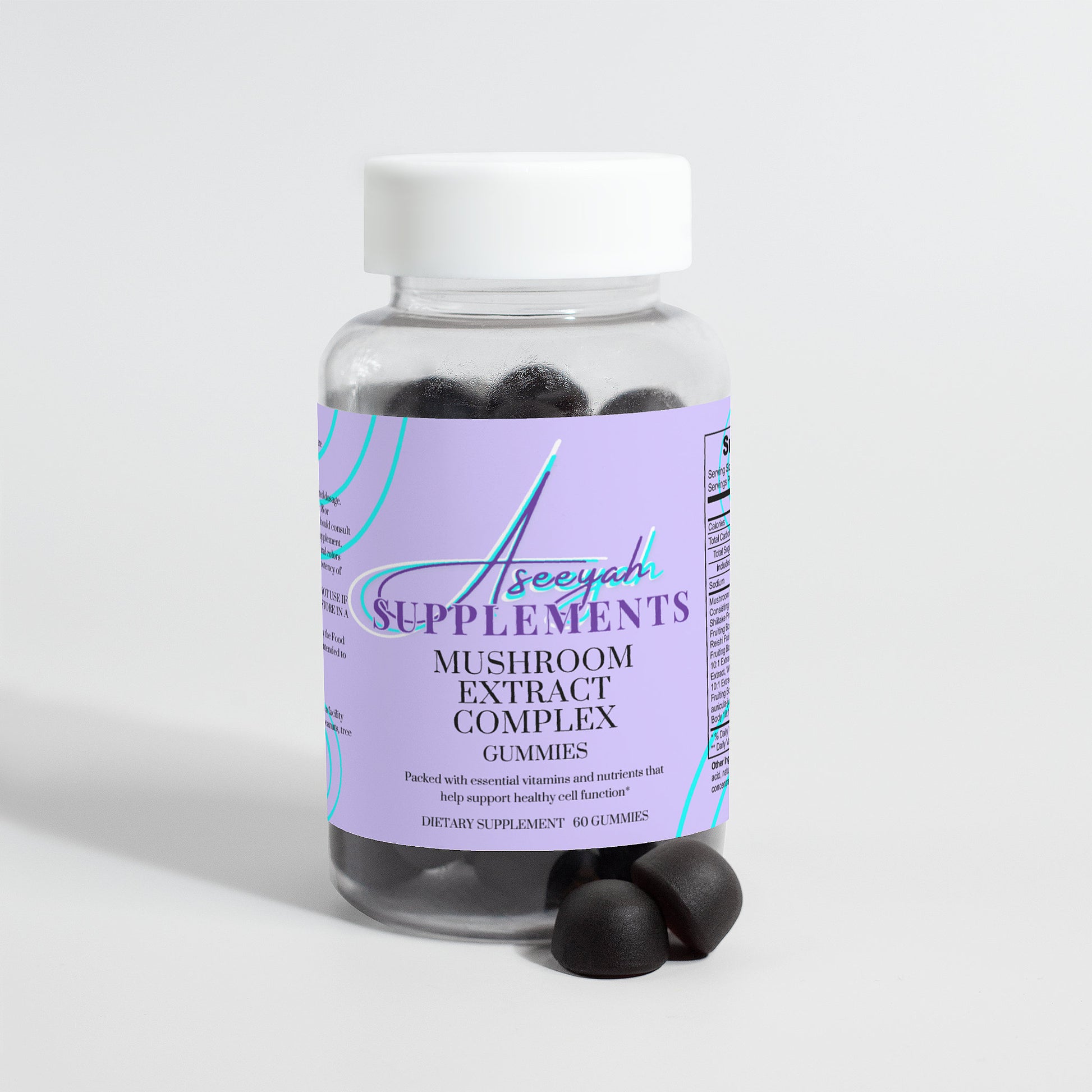 Ingredients: Mushroom extract (Maitake Fruiting Body 10:1 Extract, Shiitake Fruiting Body 10: 1 Extract, Lion’s Mane Fruiting Body 10:1 Extract, Reishi Fruiting Body 10:1 Extract, Cordyceps Fruiting Body 10:1 Extract, Chaga Fruiting Body 10:1 Extract, Turkey Tails Fruiting Body 10:1 Extract, White Button Mushroom Fruiting Body 10:1 Extract, Black Fungus Fruiting Body 10:1 Extract, Royal Sun Mushroom Fruiting Body 10:1 Extract), glucose syrup, sugar, dextrose, pectin, citric acid, natural raspberry flavor, sodium citrate, purple carrot juice concentrate, palm oil (contains carnauba wax).